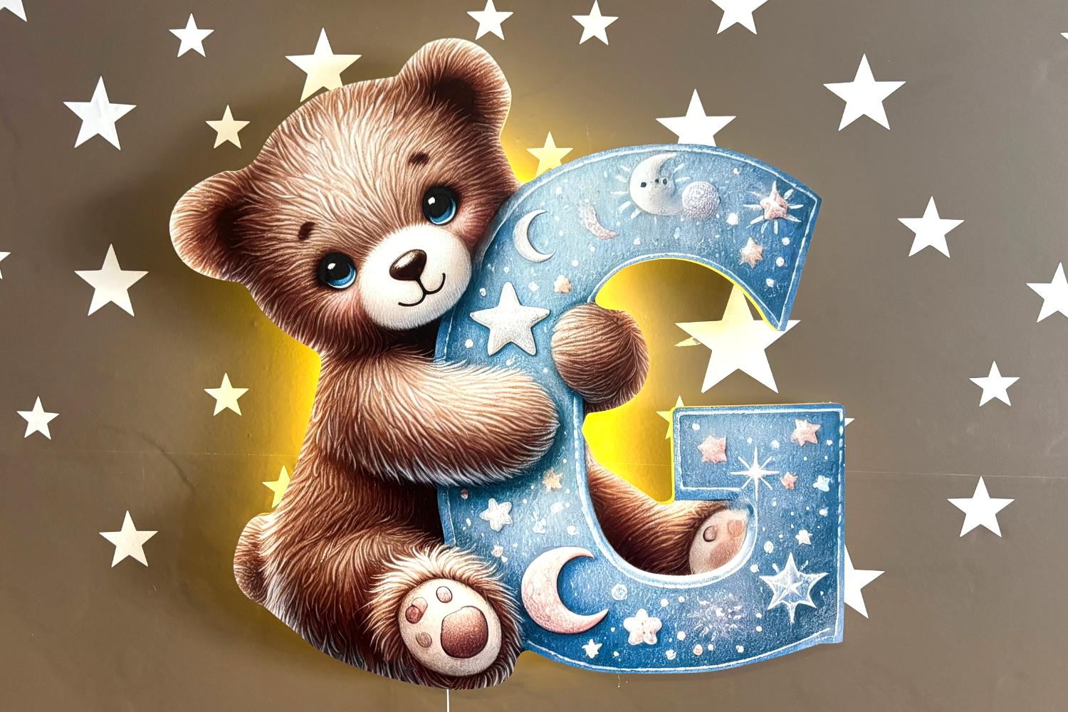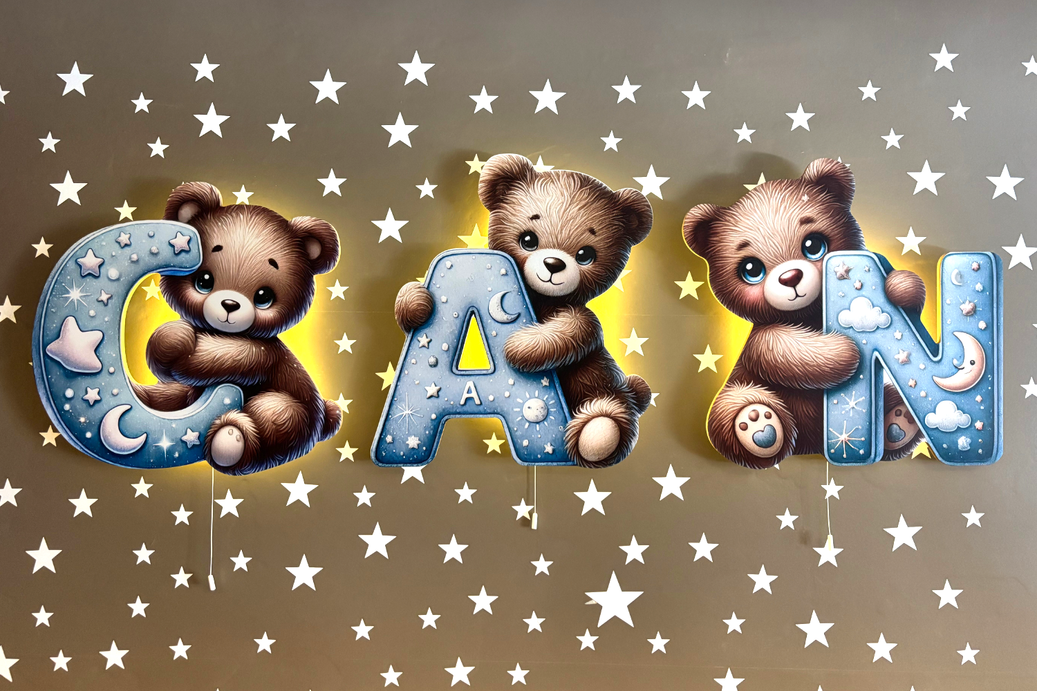 Bebek ve çocuk odaları için sevgiyle hazırlanan ayıcıklı harf lambalarımız, ahşap üzerine uygulanan özel baskı tekniği ile üretilir ve bebeğin ismine özel olarak kişiselleştirilir. Günışığı lambalarımız sayesinde güvenli ve huzurlu bir uyku ortamı oluşturur.