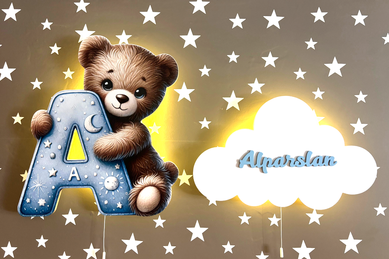 Bebek ve çocuk odaları için sevgiyle hazırlanan ayıcıklı harf lambalarımız, ahşap üzerine uygulanan özel baskı tekniği ile üretilir ve bebeğin ismine özel olarak kişiselleştirilir. Günışığı lambalarımız sayesinde güvenli ve huzurlu bir uyku ortamı oluşturur.