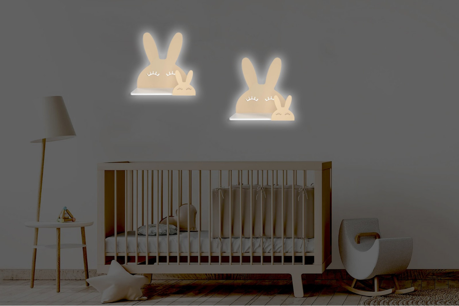Hem fonksiyonel hem sevimli tavşan raf lambalarımız, bebeğinizin güvenle uyuyabileceği yumuşak ışık sağlar ve oyuncakları, kitapları düzenleyecek çok amaçlı raf sunar.