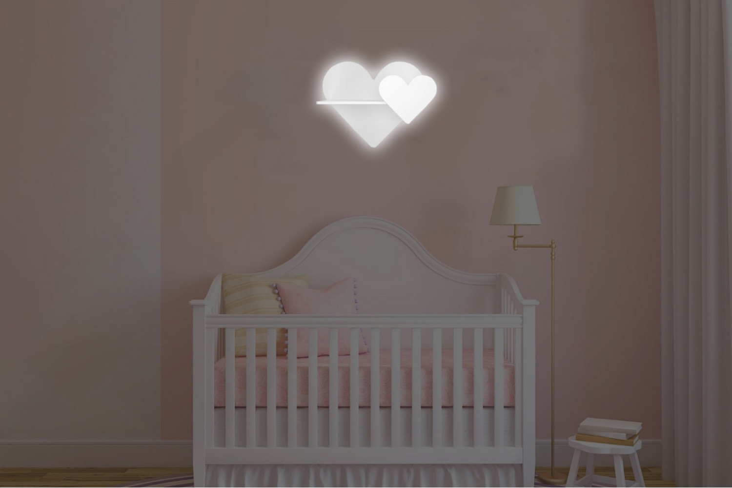 Hem fonksiyonel hem sevimli kalp raf lambamız, bebeğinizin güvenle uyuyabileceği yumuşak ışık sağlar ve oyuncakları, kitapları düzenleyecek çok amaçlı raf sunar.